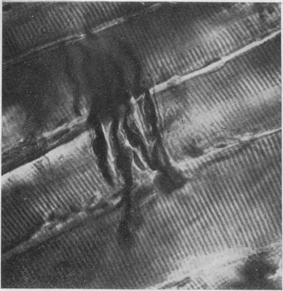 Рис. 64. Собственно жевательная мышца на 14-е сутки после повышения межальвеолярной высоты на 10 мм. Контрактура мышечного волокна. Фокус разрыва, пролиферация ядер на концах разрыва.