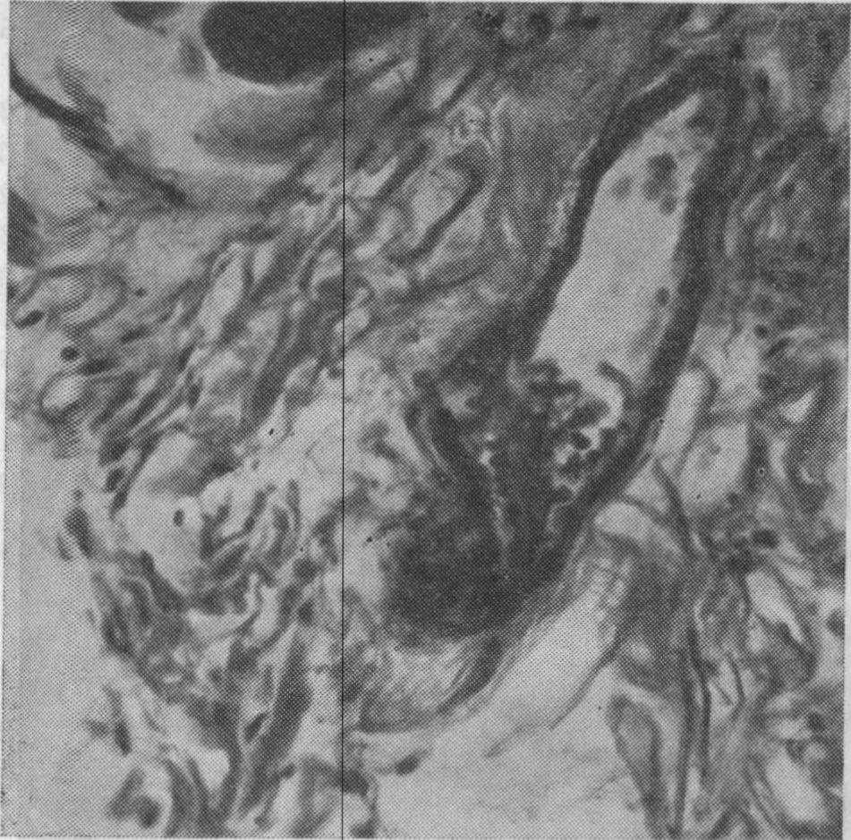 На 12-е сутки, кроме явлений, свидетельствующих о повышенной функциональной активности мышц, наблюдаются и некоторые изменения в сосудах. Просветы артерий находятся в состоянии спастического сокращения, вены и лимфатические щели в некоторых участках мышцы расширены, кое-где встречаются периваскулярные геморрагические инфильтраты, явления периваскулярного отека, пропитывания плазменными белками сосудистой стенки и межуточной ткани (рис. 59). Единичные мышечные волокна находятся в состоянии рас-