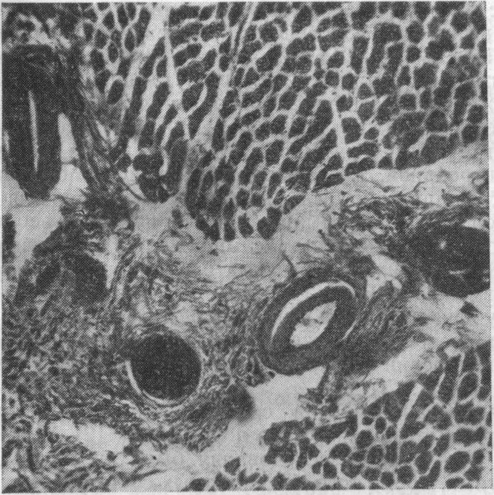 Рис. 60. Собственно жевательная мышца собаки через 16 сут от начала опыта. Артерии, залегающие в перимизии, в состоянии спастического сокращения, вены расширены, полнокровны. Отек межуточной ткани.