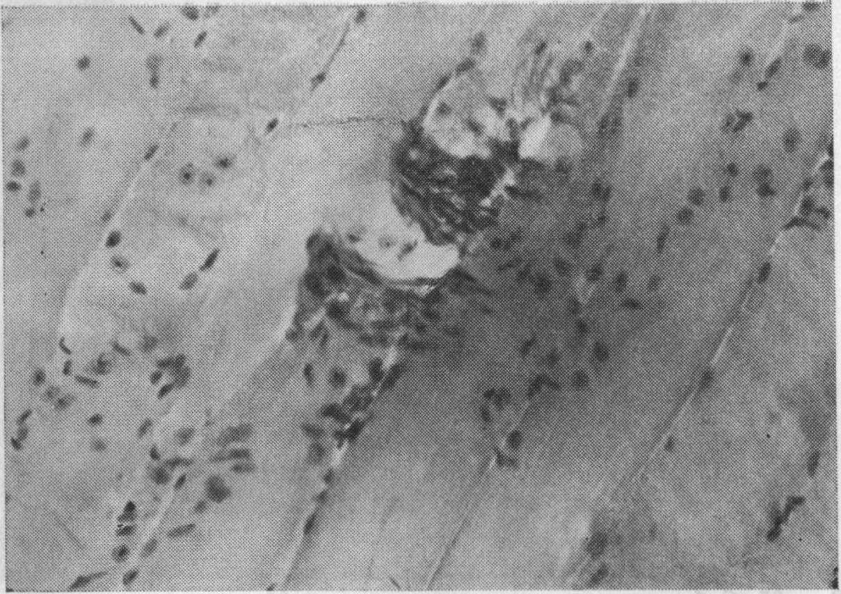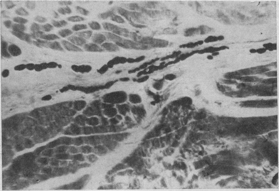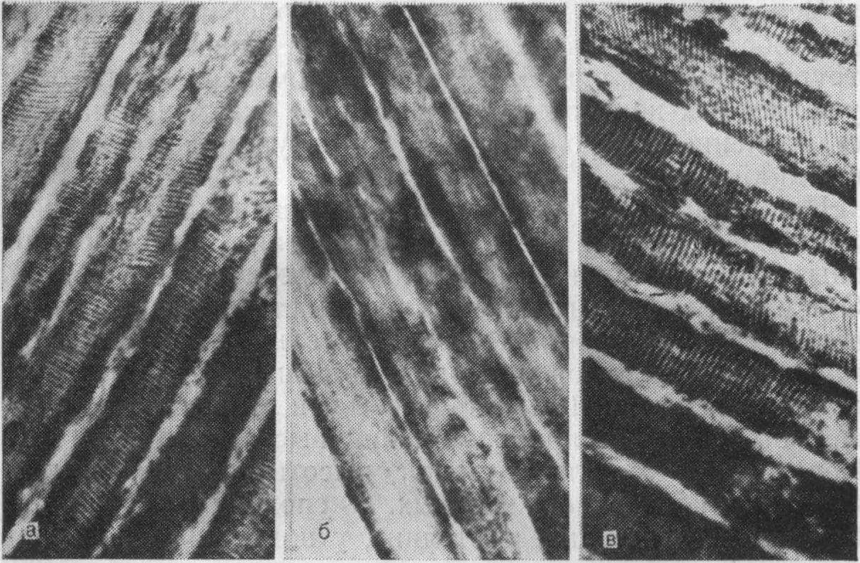 пада. Гликоген в отдельных мышечных волокнах распределяется неравномерно. В других опытах сосудистые реакции в виде повышенной проницаемости стенок и геморрагических инфильтратов не наблюдались.