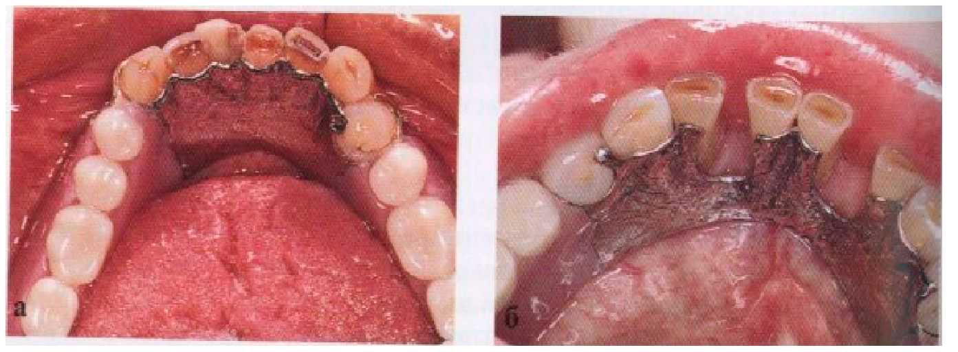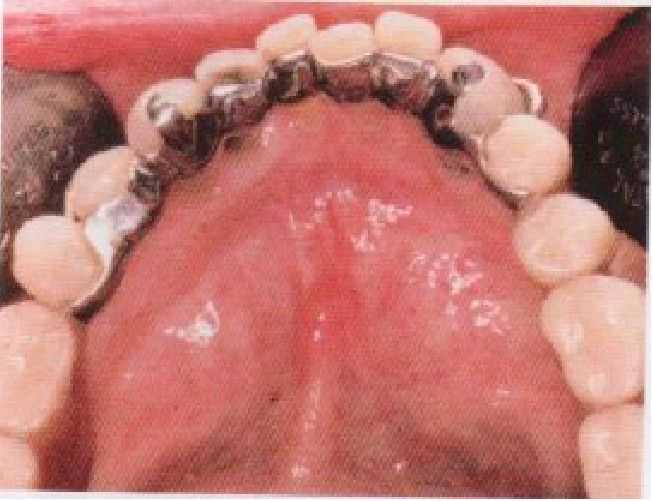 Кроме того, наличие увеличившихся межзубных промежутков, часто образующихся в результате пародонтологического лечения, в любом случае приведет к тому, что металл язычного базиса станет заметен, что является неприемлемым. Язычная пластинка обычно применяется при протяженных двусторонних концевых дефектах нижних зубных рядов.
