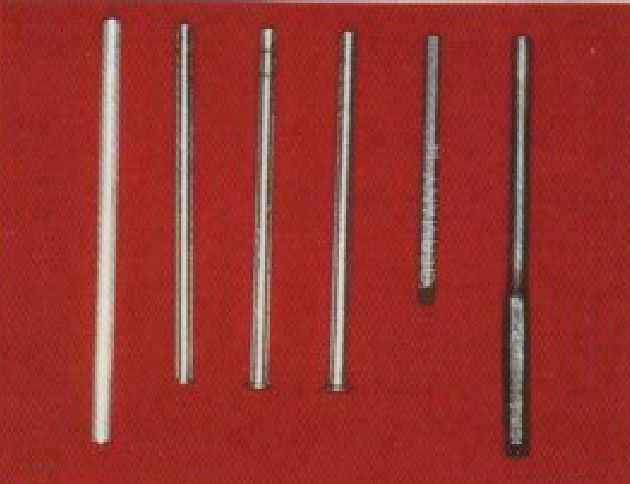 Рис. 6-2. Инструменты для параллелометра (слева направо): анализирующий стержень, измерительные стержни с указателями глубины поднутрений 0,25; 0,5 и 0,75 мм, графитовый стержень, шпатель для моделирования восковых заготовок.