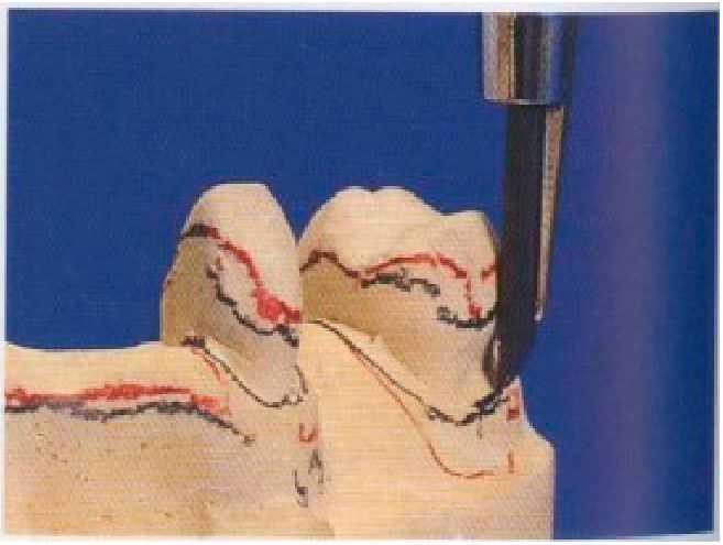 Располагая графитовый стержень напротив зубов и мягких тканей, можно провести разделительную линию, идущую то низко, то высоко для каждой области поднутрения. Указанные линии в конечном счете объединяют в единую, которая полностью очерчивает область поднутреРис. 6-3, Верхняя и нижняя раздели-