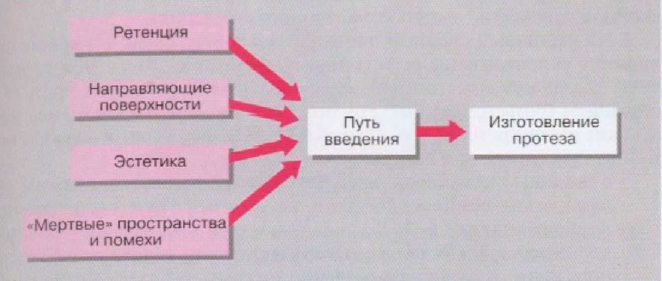 Рис. 6-5. Факторы, влияющие на выбор пути введения протеза. После того как он выбран, конструирование съемного протеза может быть завершено.