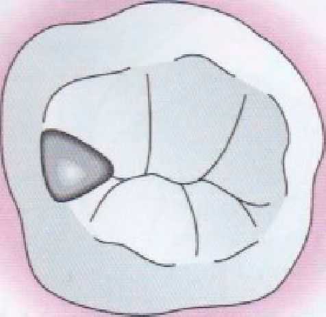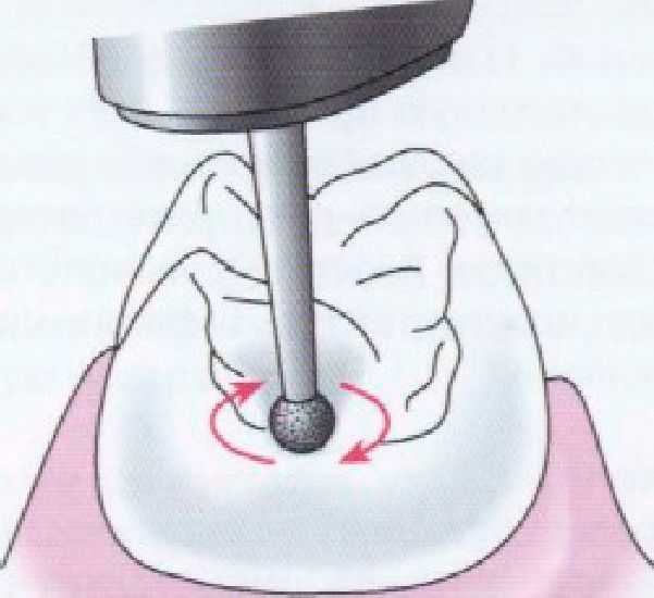 Препарирование начинается с сошлифовывания и закругления средней трети краевого гребня с помощью шаровидной алмазной головки подходящего размера (№6 - для моляров, №4 - доя премоляров) (рис. 10-8). Датее следует углубление соседней фиссуры, которая потом плавно переходит в краевой гребень. После завершения препарирования полость внимательно изучают доя того, чтобы убедиться в отсутствии помех для созданного пути введения протеза, а обнаруженные незначительные неровности эмали сглаживают