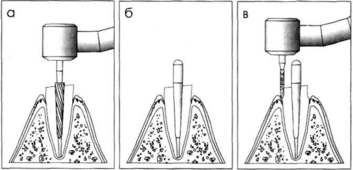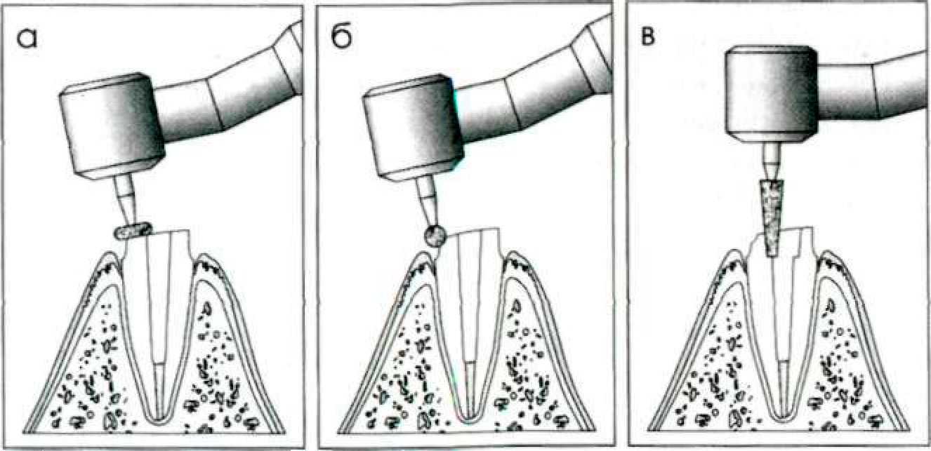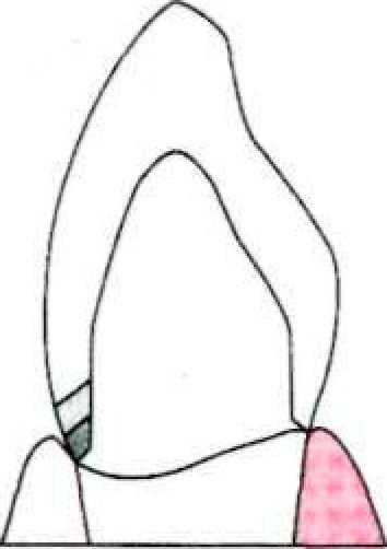 На следующем этапе сглаживают острые края с укорочением твердых тканей до 1,5 мм выше десневого уровня. С вестибулярной стороны формируют круглый уступ, располагающийся выше пришеечного уступа. После этого производится препарирование внутренней части корня под полость ящикообразной формы, распределяющей жевательную нагрузку (рис. 99).