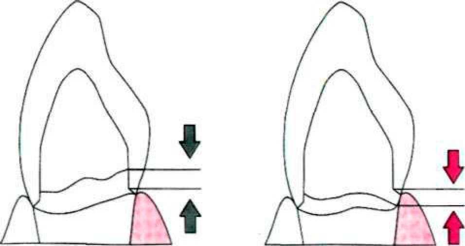 В идеальном случае границы препарирования в придесневой области должны быть видны невооруженным глазом или доступны для проверки зондом. Такое наддесневое или придесневое положение края коронки идеально для снятия оттиска, оценки точности прилегания и последующего проведения гигиенических мероприятий. Однако в этом случае страдает эстетика. Поэтому подобное препарирование целесообразно проводить только в жевательной области. Во фронтальном отделе с вестибулярной стороны проводится поддесневое препарирование с погружением коронки на 0,5 мм в зубодесневой желобок. Положение уступа при кариозном разрушении зуба определяется степенью разрушения. Между краем коронки и восстановительным пломбировочным материалом должно находиться около 1 мм полноценных твердых тканей зуба (рис. 90).