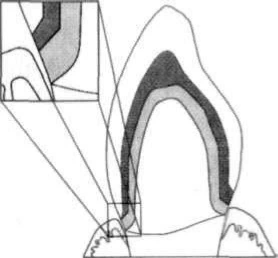 Рис.91. Препарирование при применении интракоронарных замковых креплений Препарирование при применении телескопических фиксаторов Препарирование опорных зубов при применении телескопических фиксаторов проводят с круговым поддесневым уступом в 135° и сохранением высоты коронковой части не менее 5 мм (рис. 92). По сравнению с препарированием под металлокерамическую коронку сошлифовывается на 0,3 мм больше твердых тканей для размещения первичной коронки. В работе можно использовать алмазные турбинные боры: № 314.697.524 для маркировки кругового уступа, для снятия слоя эмали № 314.142.534, для препарирования дентина № 314.173.524; № 314.131.514 для предварительного оформления уступа № 314.033.534 для обработки окклюзионной поверхности (формы рабочей части даны по стандарту ISO). Окончательное оформление уступа проводится микромотором со скоростью вращения до 50 тыс. об./мин алмазными или твердосплавными борами. Препарированиезавершается сглаживанием острых кромок и маркировкой вертикагьного желобка по месту изготовления фрикционного штифта. Рис.92. Препарирование опорных зубов под телескопическую коронку При незначкельном количестве сохранившихся зубов, когда и применяются главным образом телескопические коронки, на опорных зубах оченьчасто определяется пародонтальный карман, глубиной более 1,5 мл. При нормальных условиях граница препарирования лежит у дна зубодесневой борозды, здесь проходит замыкающий край телескопичэской коронки. В условия пародонтального кармана не следует стремиться проводить препарирование на всю глубину. Чем глубже в пощесневую область планируется погружение края коронки, тем больие неточностей может возникнуть при снятии оттисков и, в конечном итоге, ухудшится качество прилегания первичной коронки к отпрепарированному зубу, что может приводить к хронической травме дэсневого края, ретракции десны и развитию вторичного кариеса под коронкой. Поэтому целесообразно в условиях пародонтального кармана проводить поддесневое препарирование на глубину не более 1 мм или проводить предварительную пародонтологическую коррекцию хирургическим способом. Поддеснева! часть отпрепарированной культи закрывается только каркасом перзичной коронки, поэтому поддесневой край внутреннего телескопа специально выделяют путем полировки от поверхности сцеплени!, покрываемой наружным телескопом. Край наружюй телескопической коронки заканчивается непосредственно перед десневым краем и не погружается под десну. Слишком длинный наружный телескоп, который погружается в поддесневую область вызывает образование неприятного запаха вследствие того, что в «зазор» между первичной и вторичной коронками всасывается жидкость из зубодесневой борозды. Поэтому внутренняя телескопическая коронка длиннее наружной коронки на величину поддесневого полированного края (рис. 93).