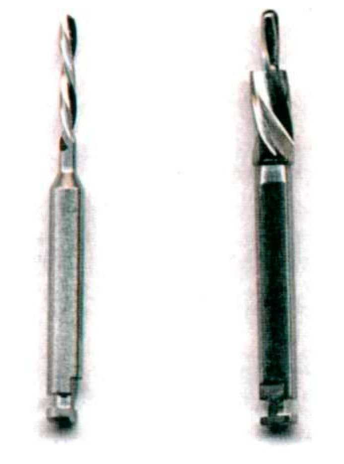 Существует несколько видов подготовки опорных зубов для изготовления покрывных протезов: • с телескопическими фиксаторами; • с поддерживающими элементами; • с аттачменами в канале корня; • с аттачменами на корневых колпачках; • с магнитными фиксаторами. Подготовка опорных зубов при применении покрывных протезов с телескопическими фиксаторами ничем не отличается от препарирования при изготовлении комбинированных протезов с фиксацией телескопическими коронками. Препарирование опорных зубов под поддерживающие элементы может проводиться двумя способами. В первом случае после сошлифовывания опорного зуба до 1 мм выше десневого уровня производится закрытие входа в корневой канал пломбировочным материалом. Во втором случае опорный корень покрывают литым колпачком, поэтому подготовка твердых тканей производится как при изготовлении культевой вкладки. Подготовка корней зубов под ретенционные элементы, установленные непосредственно в канал корня и под магнитные фиксаторы, аналогична установлению анкерного штифта. К каждому ретенционному элементу фирма-производитель прилагает специальные развертки для подготовки канала корня (рис.94).