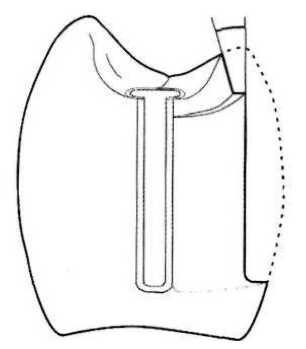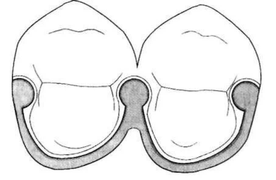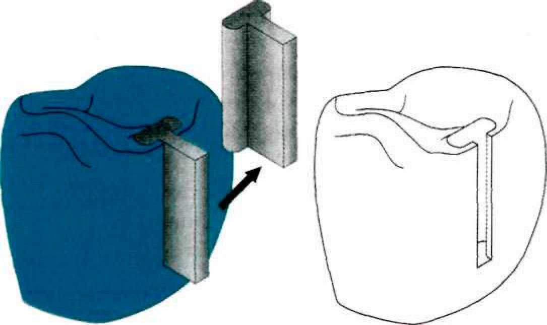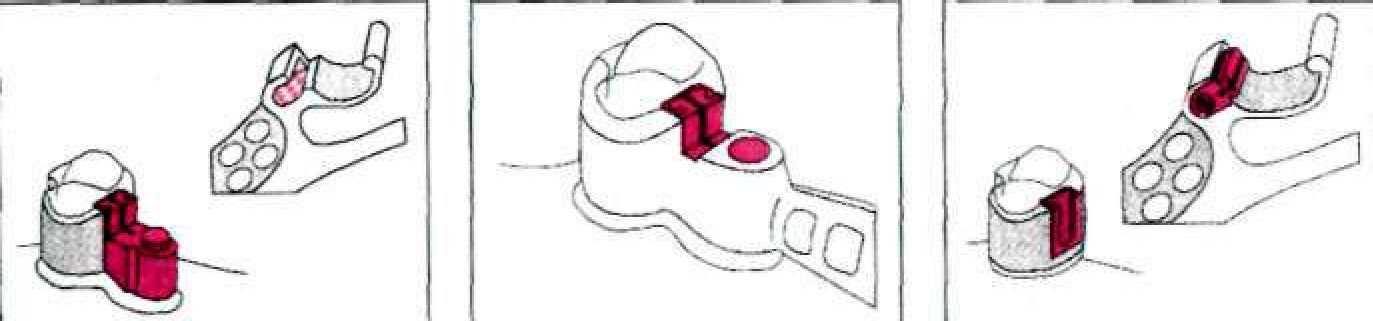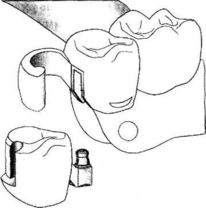 На противоположной от аттачмена стороне опорной коронки располагают стабилизатор, или интерлок, который может быть изготовлен индивидуально или с применением фабричной заготовки. Интерлок помешают на глубину 2/3 фрезерованной поверхности параллельно замковому креплению. Фрезерование интерлока проводят фрезой в 0 градусов. Диаметр интерлока должен быть не менее 0,8 мм и зависит от толщины стенок коронок, которые в свою очередь должны быть не менее 0,3 мм. Расстояние, на которое интерлок должен быть погружен между опорными коронками, составляет3/4 диаметра фрезы. При рассмотрении интерлока с окклюзионной поверхности он должен выглядеть в виде буквы Q, только такая форма интерлока гарантирует предохранение протеза от боковых смещений (рис. 150).