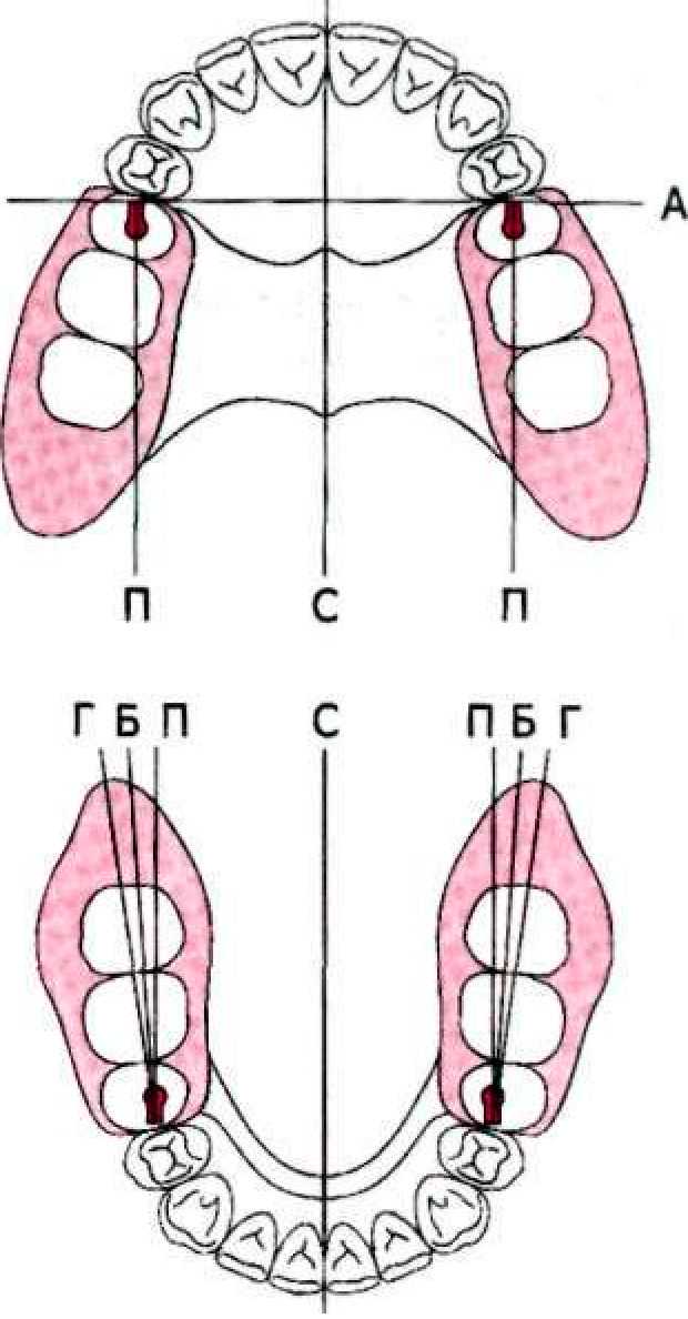 При включенных дефектах, дистально ограниченных одиночно стоящими молярами, возможно изготовление окклюзионно открытых телескопических коронок. В этом случае окклюзионная поверхность первичной коронки контактирует с антагонистами. При фрезеровании первичной коронки создают пришеечный и окклюзионный уступ. В каркасе съемной части протеза вместо вторичной коронки моделируют телескопическое кольцо. При применении балочной системы фиксации лучше использовать промышленно выпускаемые заготовки. Благодаря этому практически к минимуму сводится объем фрезерования на этапах моделирования и обработки каркасов. При фрезеровании следует учитывать конусность балок и применять фрезы с соответствующим углом конусности. Фрезерование балок требуется лишь в участках соединения с опорными коронками и, в основном, сводится к чистовой обработке отлитых фиксаторов. Фрезерование при изготовлении комбинированных протезов начинается с выбора фрез. В зависимости от обрабатываемого материала (воск, пластмасса, металл) и стадии обработки (черновая, чистовая или отделочная) разработаны разные фрезы, которые различаются числом граней или лезвий (от одного до десяти и более), углами подъема винтовой линии лезвий и их заточкой (от тупого до острого с разными числовыми величинами) и направлением витка (правым или левым). Для фрезерования воска используются шаберы и фрезы с одним, двумя и тремя лезвиями с целью избежания залипания воска в межлезвийных канавках. При этом лучше выбирать фрезы, имеющие спиралевидную форму режущей поверхности, что обуславливает лучшую транспортировку восковой стружки и хорошую видимость обрабатываемой поверхности. Для фрезерования металлических каркасов, создания пазов применяют сверхтвердые многолезвийные фрезы. Другим важным моментом является выбор воска для фрезерования. Предпочтительнее выбирать воск темного цвета, что позволяет хорошо видеть отдельные детали фрезеруемой поверхности. Воск должен быть достаточно твердым, чтобы при фрезеровании не создавалось мажущего эффекта и стружка была бы «сухой». Фаза текучести воска должна быть как можно короче, что экономит время при моделировании и позволяет подлить и смоделировать тончайшие детали. До начала фрезерования проводится параллелометрия отпрепарированных зубов для установления пути введения протеза и оптимального угла фрезерования. После этого изготавливаются восковые колпачки и дополняются воском до полного контура на коронках, подлежащих фрезерованию. В том случае, если применяется интракоронарное замковое крепление, оно должно быть установлено до начала фрезерования. После этого устанавливаются стабилизаторы (или интерлоки) при использовании фабричных заготовок. Если в качестве фиксатора выбраны экстракоронарные замковые крепления, то лучше вначале отфрезеровать пришеечный уступ, лингвальную стенку, окклюзионный уступ, интерлоки, а затем установить замковое крепление. Для правильного функционирования все замковые крепления следует размещать параллельно друг к другу: на верхней челюсти — на линии П, параллельной срединной линии С; на нижней челюсти — на линии Б, являющейся биссектрисой угла, образованного линией П, параллельной срединной линии, и линией Г (средней линией альвеолярного гребня) (рис.151).