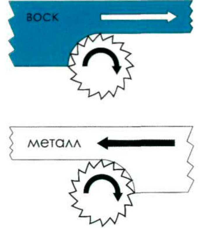 Технология фрезерования включает ряд принципов, применяющихся в промышленном фрезеровании. К ним относится способ фрезерования: встречное или попутное и скорость фрезерования (количество оборотов фрезы в минуту). При фрезеровании восковой заготовки применяется метод попутного фрезерования для получения гладкой поверхности (рис. 152). При этом направление вращения фрезы совпадает с направлением подачи восковых заготовок. Частота (скорость) вращения фрезы при фрезеровании восковой заготовки варьирует в диапазоне от 2 до 5 тысяч оборотов в минуту. Метод встречного фрезерования используется для металлических каркасов (рис. 152). При этом методе направление вращения фрезы и заготовки противоположны, при фрезеровании по металлу скорость вращения увеличивается от 15 до 20 тысяч оборотов в минуту.