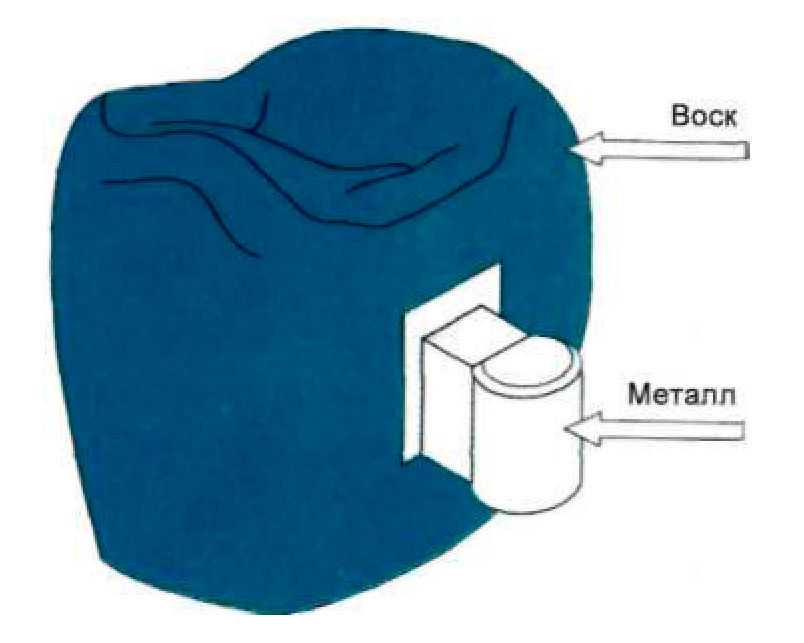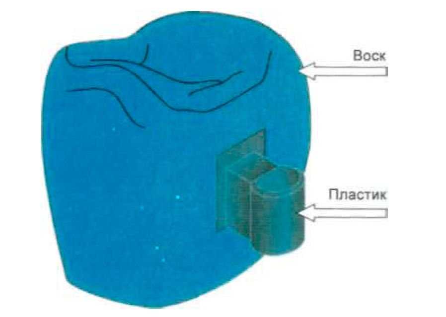 Для предотвращения напряжений в каркасе при использовании в литье готовых аттачменов, отливка должна медленно охлаждаться на воздухе до комнатной температуры. При работе с каркасами, отлитыми с готовыми замковыми креплениями, нельзя допускать контакта керамической массы со сплавом аттачмена. Из-за различных коэффициентов теплового расширения сплава каркаса и аттачмена в керамической облицовке могут образовываться трещины. Техника «spacer» «Spacer» — это заготовка из специально обработанного оксида алюминия (чаше всего патрица). Керамическая заготовка устанавливается в каркас несъемной конструкции на этапе моделировки. При последующем литье «spacer» не выгорает и таким образом дает точную копию формы матрицы аттачмена на отлитой детали (рис. 155). Керамическая заготовка затем удаляется из готового каркаса.