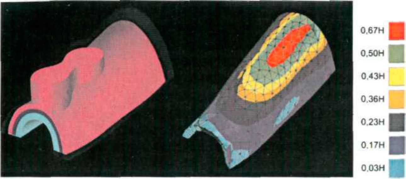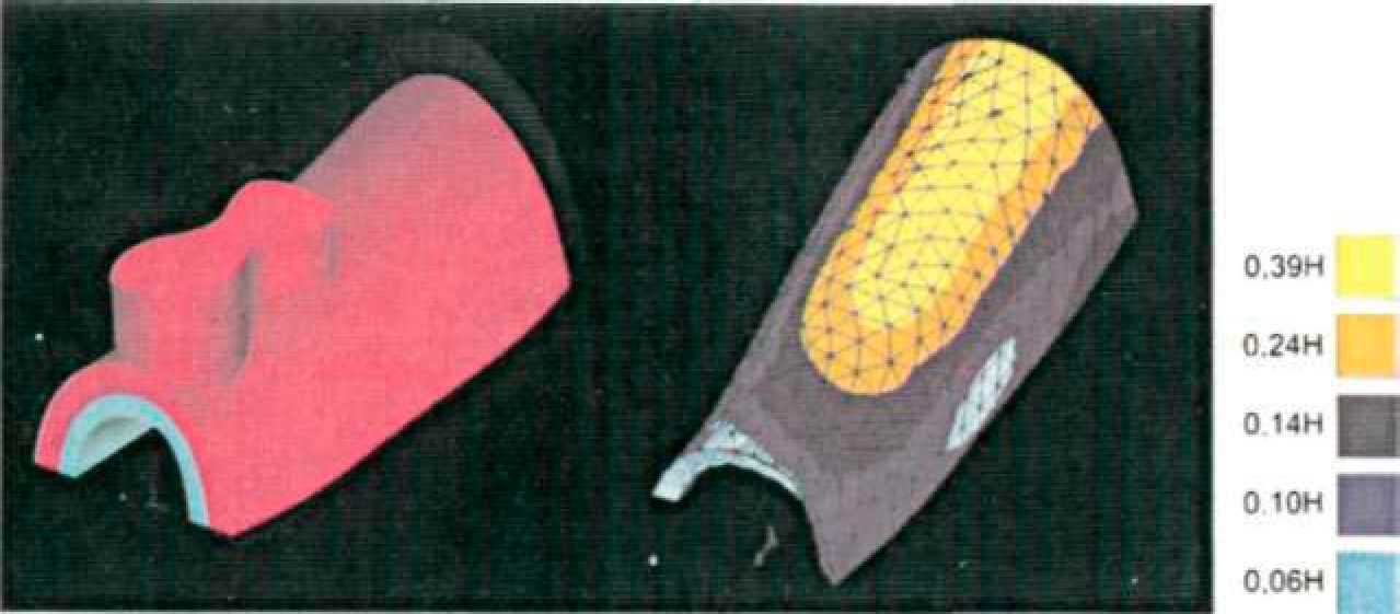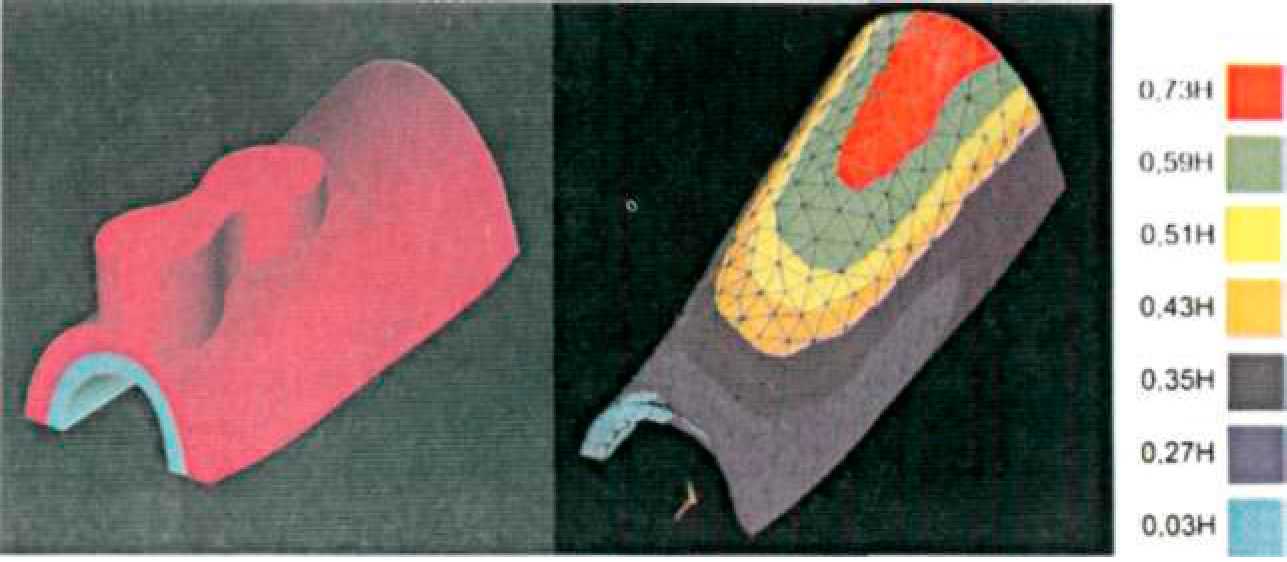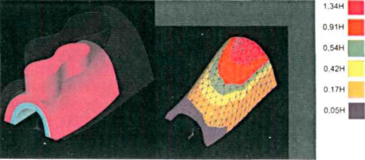 | ФИЗИКО-МАТЕМАТИЧЕСКОЕ МОДЕЛИРОВАНИЕ РАСПРЕДЕЛЕНИЯ НАПРЯЖЕНИЙ МЕЖДУ ОПОРНЫМИ ТКАНЯМИ ПРИ ПРОТЕЗИРОВАНИИ КОНЦЕВЫХ ДЕФЕКТОВ ЗУБНЫХ РЯДОВ На кафедре Госпитальной ортопедической стоматологии МГМСУ был проведен комплекс экспериментальных и клинико-лабораторных исследований для изучения распределения жевательного давления между пародонтом опорных зубов и слизистой оболочкой протезного ложа при концевых дефектах зубных рядов. Нас интересовал характер распределения напряжений между опорными зубами и слизистой оболочкой протезного ложа при различном состоянии опорных тканей и в зависимости от конструкции протеза. Для упрощения моделирования все исследования проведены на модели малого седловидного протеза. По литературным данным, в отличие от съемного протеза при двустороннем концевом дефекте зубного ряда на слизистую оболочку протезного ложа при одностороннем дефекте приходится большее жевательное давление, но характер распределения давления между опорными тканями сохраняется. Совместно с доктором технических наук, профессором кафедры РК-5 МВТУ им. Баумана С.С. Гаврюшиным была создана трехмерная модель беззубого участка альвеолярного гребня нижней челюсти, на которой смоделирован малый седловидный протез. Дальнейшие исследования проведены при различных конструкциях малого седловидного протеза: • максимально расширенные границы базиса протеза; • базис протеза с укороченными границами до ретромолярного треугольника; • уменьшенное число искусственных зубов на базисе протеза; • базис протеза с мягкой подкладкой; • различное жесткое и полулабильное замковое крепление протеза к опорным зубам. В результате математических расчетов мы установили, что качественная картина распределения деформации в слизистой оболочке протезного ложа при жестком или полулабильном креплении однотипна. При расширенных границах базиса протеза с перекрытием ретромолярного треугольника применение жесткой системы фиксации не приводит к повышенной нагрузке на опорные ткани, если под опору базиса малого седловидного протеза используются как минимум два зуба с непораженным пародонтом. Применение в данном варианте протеза полулабильного крепления увеличивает напряжение в слизистой оболочке протезного ложа на 23 %, приближаясь к предельно допустимому значению. При уменьшении площади базиса до границы ретромолярного треугольника нагрузки возрастают почти в два раза как на опорные зубы, так и на слизистую оболочку по сравнению с базовой моделью. На рисунке 337 область максимальных значений представлена малиновым цветом. При уменьшении числа искусственных зубов на базисе протеза точка приложения нагрузки смещается к опорным зубам, что на 20,3 % снижает давление на слизистую оболочку и на 7,8 % нагрузку на опорные зубы (рис. 338). Применение мягкой подкладки в малом седловидном протезе с жестким замковым креплением оказывает двоякое действие: снижает давление на слизистую оболочку на 14,5 % и повышает вывихивающий компонент нагрузки на опорные зубы на 20,25 % (рис. 339).