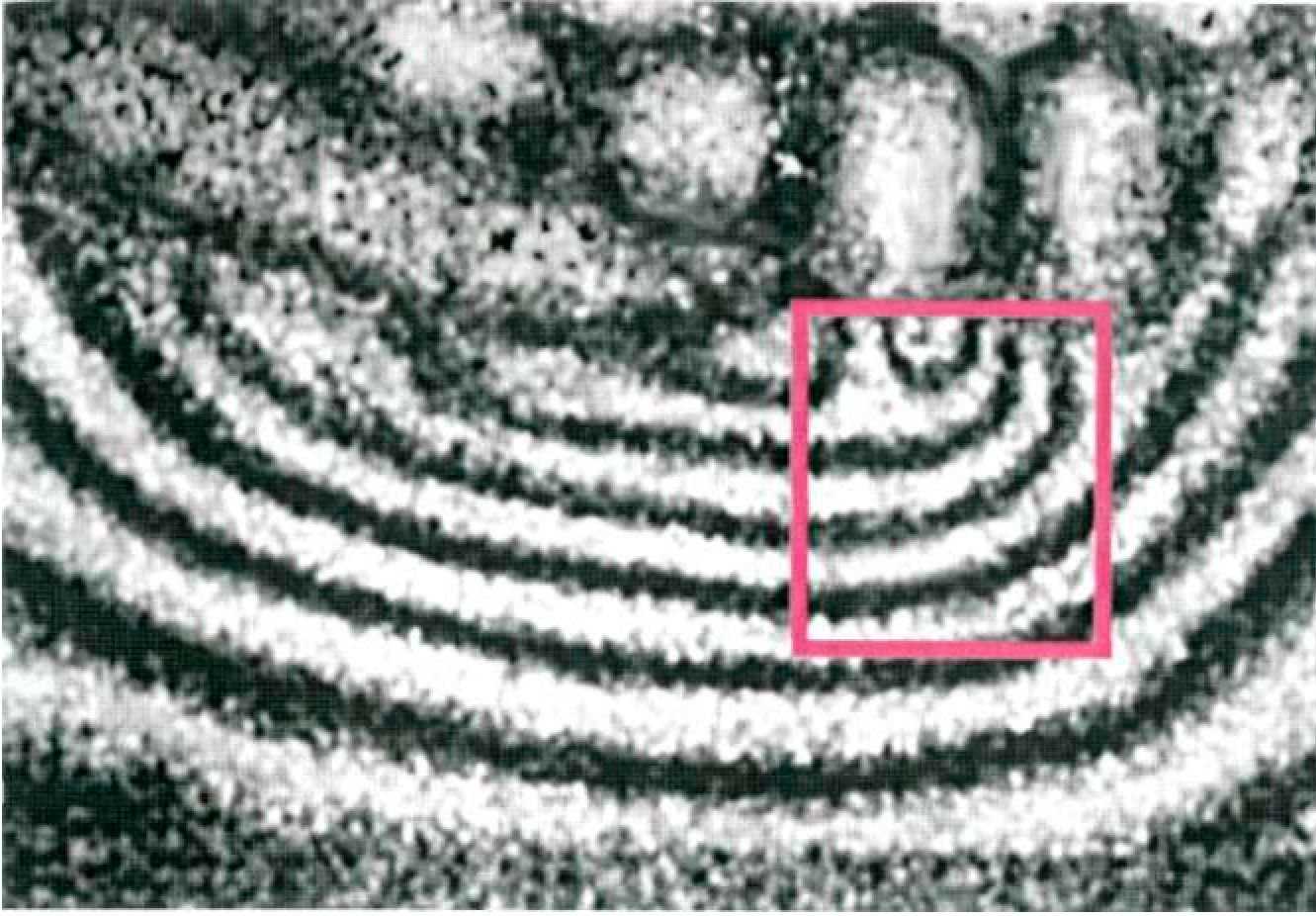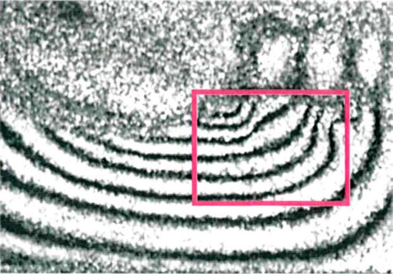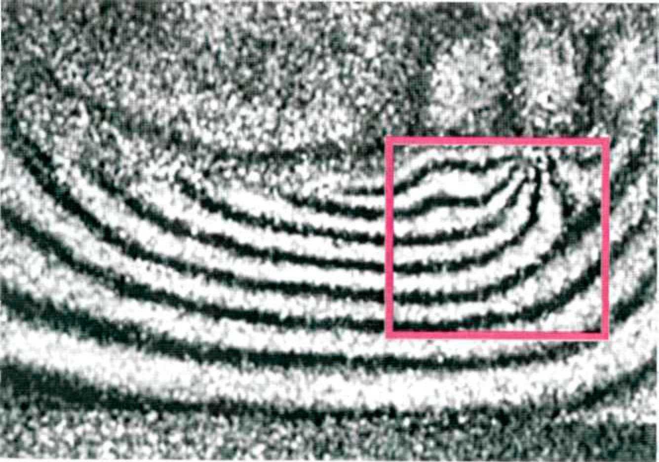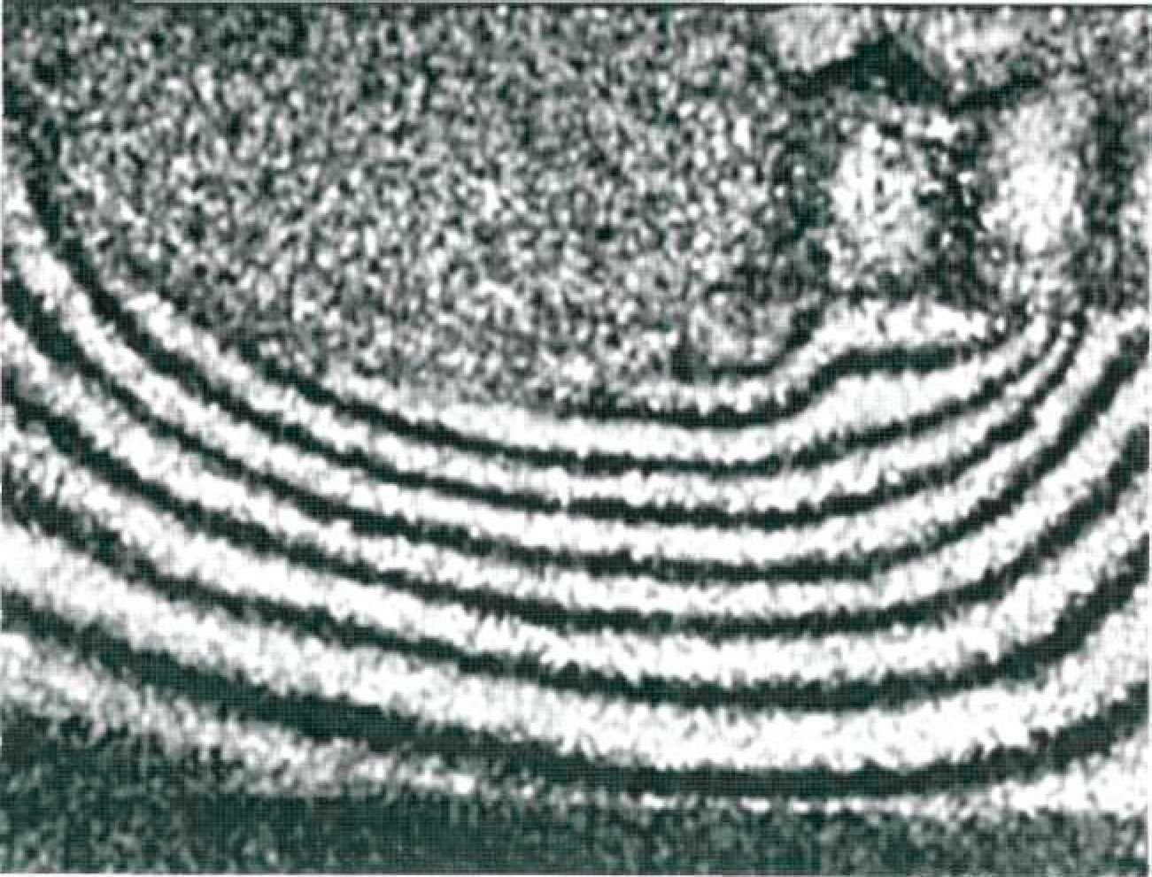 На кафедре физики прочности Московского инженерно-физического института под руководством кандидата технических наук, доцента В.П. Щепинова были выполнены экспериментальные исследования для оценки достоверности математических расчетов. Методом электронной спекл-интерферометрии мы изучили характер и степень деформирования кости нижней челюсти под малым седловидным протезом с жесткой или полулабильной фиксацией в специально сконструированном нагружающем устройстве при следующих вариантах клинических ситуаций: • различное состояние пародонта опорных зубов; • различное состояние податливости слизистой оболочки протезного ложа; • различные типы альвеолярного гребня. Метод электронной спекл-интерферометрии заключается в следующем. При освещении шероховатой поверхности объекта когерентным лазерным излучением наблюдается спекл-эффект. При этом кажется, что в пространстве распределены белые и темные точки, называемые спеклами. Полосы спекл-корреляции образуются в результате вычитания двух спекл-картин, одна из которых получена до, другая — после деформации исследуемого объекта, в данном случае им являлась мацерированная нижняя челюсть человека. Каждая полоса спекл-корреляции представляет собой геометрическое место точек равного смещения костной ткани. Таким образом, смещение тела в нормальном направлении приводит к изменению фазы объектного спекл-поля и, соответственно, к изменению распределения интенсивности в результирующей спекл-структуре. Регистрация результирующей спекл-картины производится при помощи ПЗС камеры, с которой изображение поступает в компьютер. На базовой модели, которой являлся альвеолярный гребень с атрофией в мезиальном отделе, интактный пародонт опорных зубов и умеренно податливая слизистая оболочка, наиболее равномерное распределение деформации костной ткани под базисом протеза и в области опорных зубов получено при жесткой системе фиксации. В этом случае полосы спекл-корреляции носят равномерный параллельный характер (рис. 340).