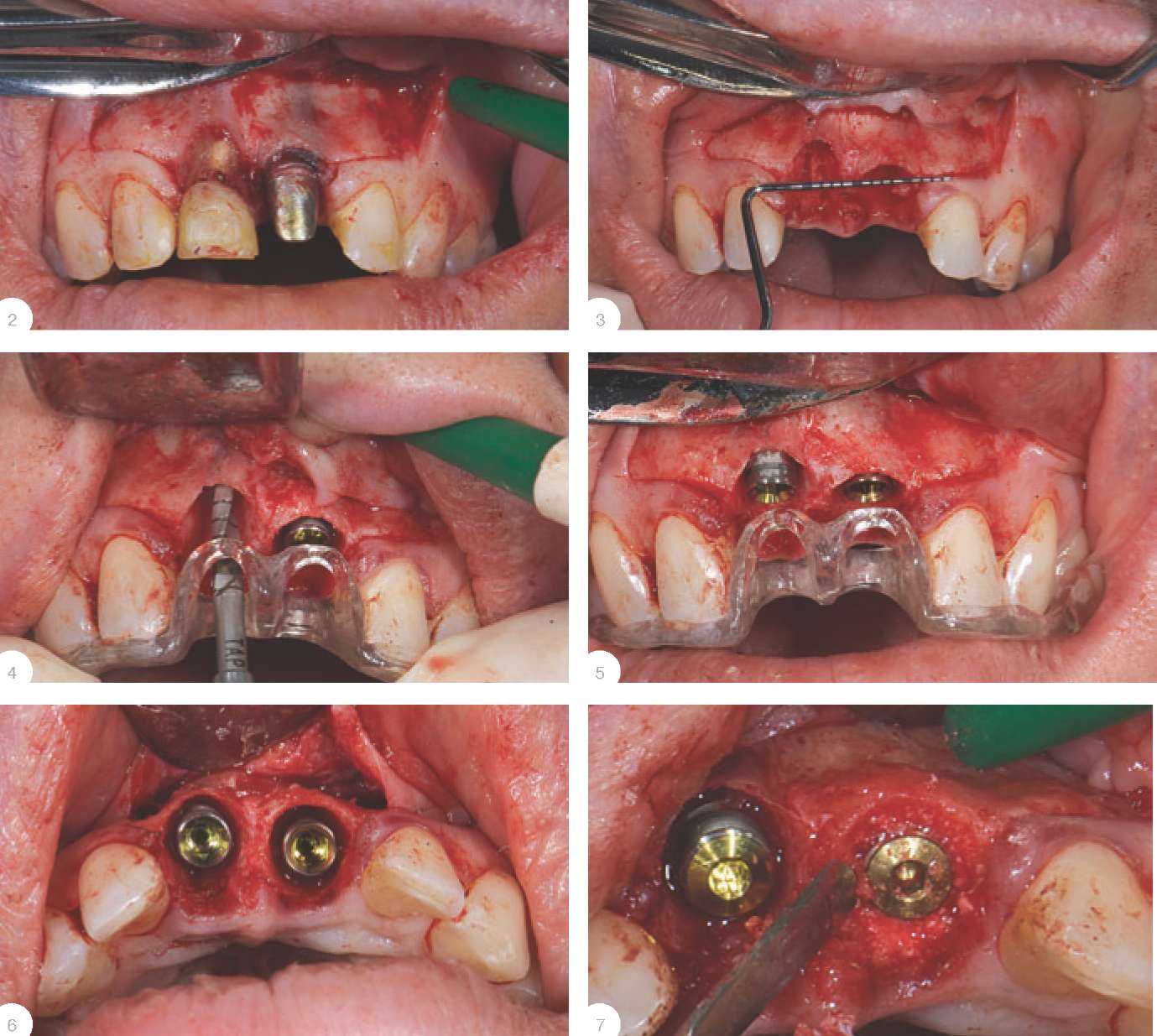Устанавливая имплантат, необходимо помнить, что крайне нерекомендованным является использование диаметров имплантатов более чем 4,5 мм! Ошибочно суждение некоторых российских хирургов о том, что если размер лунки позволяет устанавливать имплантаты до или более 5 мм, то этооправдано идеальной первичной стабилизацией имплантата. Однако в обозримом будущем касание имплантата к вестибулярной стенке альвеолы даже в верхнейтрети лунки приведет к резорбциистенки, что в свою очередь явится причиной неудовлетворительного эстетического результата. Первичная стабилизация имплантата является, наверно, главным фактором, влияющим на позитивный исход всего лечения, однакодостигать его путем бикортикального заклинивания имплантата влунке удаленного зуба недопустимо. Все, что необходимо сделать -это углубить лунку не менее, чемна 3-4 мм, и сместить ось имплан-тата небно для отсутствия контактас передней стенкой альвеолы повсе протяженности (рис. 2). Расстояние между имплантатом ипередней стенкой должно составлять от 1,5 до 2 мм. Если даннаядистанция превышает указанное значение, то мы рекомендуем использовать аутогенную кость, смешанную в равной пропорции с материалом Bio-Oss, так как последний будет выполнять роль каркасадля поддержки аутокости.Откинут лоскут, планируется удаление 11 и 21 с одномоментной имплантацией (рис. 3).Зубы 11 и 21 удалены (рис. 4). Установлены имплантаты Биого-ризонт диаметром 3,8 (рис. 5).Правильно изготовленный шаблон позволяет позиционировать нетолько ось, но и расположение шейки имплантата (рис. 6).Смещенное в небном направлении положение имплантатов хорошовидно на рис. 7. Аутогенная кость с ветви нижнейчелюсти смешана с Bio-Oss и плотно скондесирована между имплантатом и альвеолой (рис. 8-10). Временное протезирование при немедленной имплантации Временное протезирование с использованием несъемной конструкции, например коронок с винтовой фиксацией для достижения эстетического результата и социальной реабилитации пациента,возможно только при хорошей фиксации имплантата. Если естьмалейшие сомнения по этому поводу, а также при проведении НТР,мы рекомендуем ушивать имплантат и фиксировать конструкцию мериленд. |