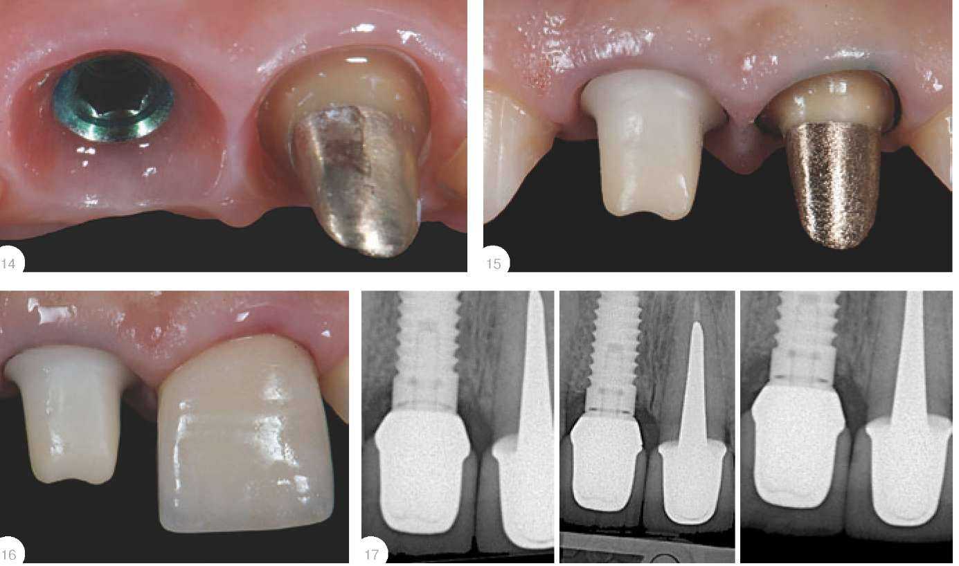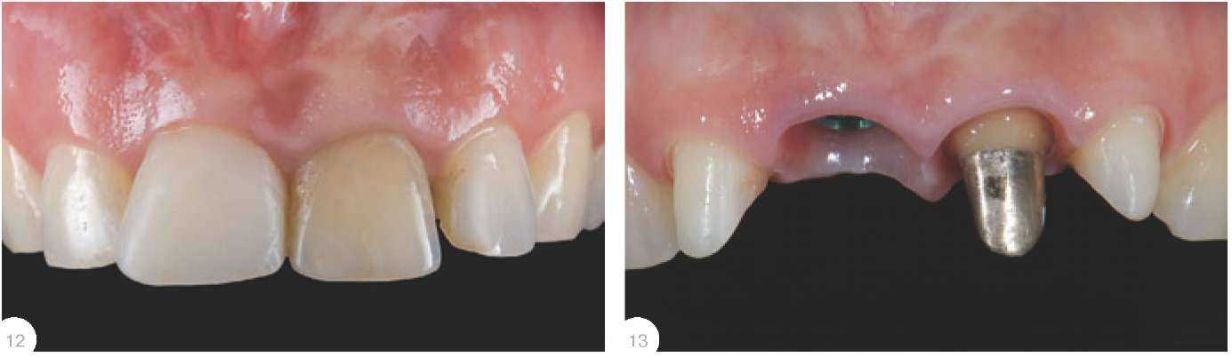 Временное протезирование имплантата может выполняться с цементной или винтовой фиксацией,когда временный пластиковый абатмент выполняет роль ядра коронки, на которую техник напрессовывает акриловый материал(рис. 11). Лично я не рекомендую изготавливать временные коронкис цементной фиксацией на временных абатментах, которые небыли индивидуализированы поддесневой контур. Они не имеютничего общего с анатомией опери-руемой зоны, так как непредсказуемость величины погружения края коронки по направлению к шейке имплантата и, как следствие, выход временного цементав непосредственной близости кпоследней, могут приводить к возникновению периимплантита.