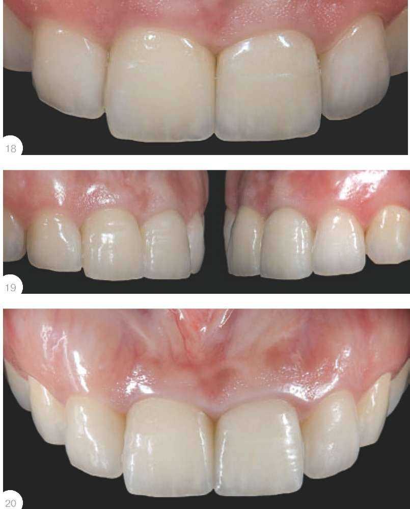 ретракционную нить без пропитки диаметром не более 000 или 00 для захвата избытка цемента.Применяя позиционер в RVG, можно увидеть факты «недопосадки»каркаса коронки на абатменте илизубах! Обратите внимание на искаженный снимок 17а, где неопытному врачу может показаться, чтоположение коронки на абатменте идеально, однако при правильном расположении позиционера виднащель в медиально-апроксимальной зоне коронки на 11 зубе. Рис. 18 - зафиксированные на самопротравливающий и самоадгезивный цемент коронки через 7дней. Ситуация через три месяцаприведена на рис. 19. По прошествии года ситуация выглядит таким образом - рис. 20. Ни у стоматолога, ни у техника, ни у пациента нетнареканий к выполненной работе.А ведь это фронтальная зона...