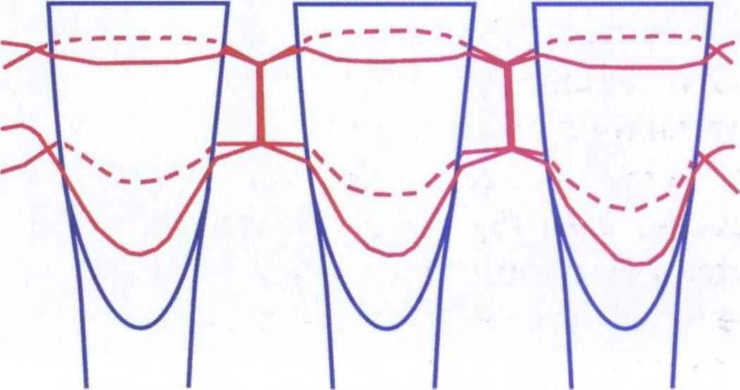 Заключается в формировании по периметру зубов двух рядов бороздок: один ряд - в пришеечной области, другой - ближе к режущему краю (окклюзионной поверхности). Затем в каждом ряду (начиная с нижнего) прокладываются и натягиваются нити, независимые и несвязанные друг с другом (рис. 4.14). После этого бороздки закрываются композитом.![]() |
