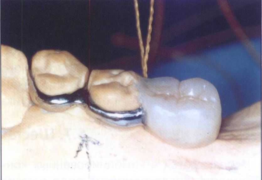 В случаях разрушения коронковой части зуба, ограничивающего дефект, можно порекомендовать комбинированную конструкцию, состоящую из консольного искусственного зуба, укрепленного на искусственной коронке, ретейнере и фиксирующей нити, которые охватывают рядом стоящий зуб (рис. 6.52).