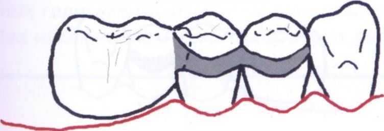 Аналогично, как и в схеме 5.1, по оральной поверхности двух опорных зубов, соседствующих с концевым дефектом, делается более широкий пропил для размещения ретейнера, который охватывает сразу два зуба.