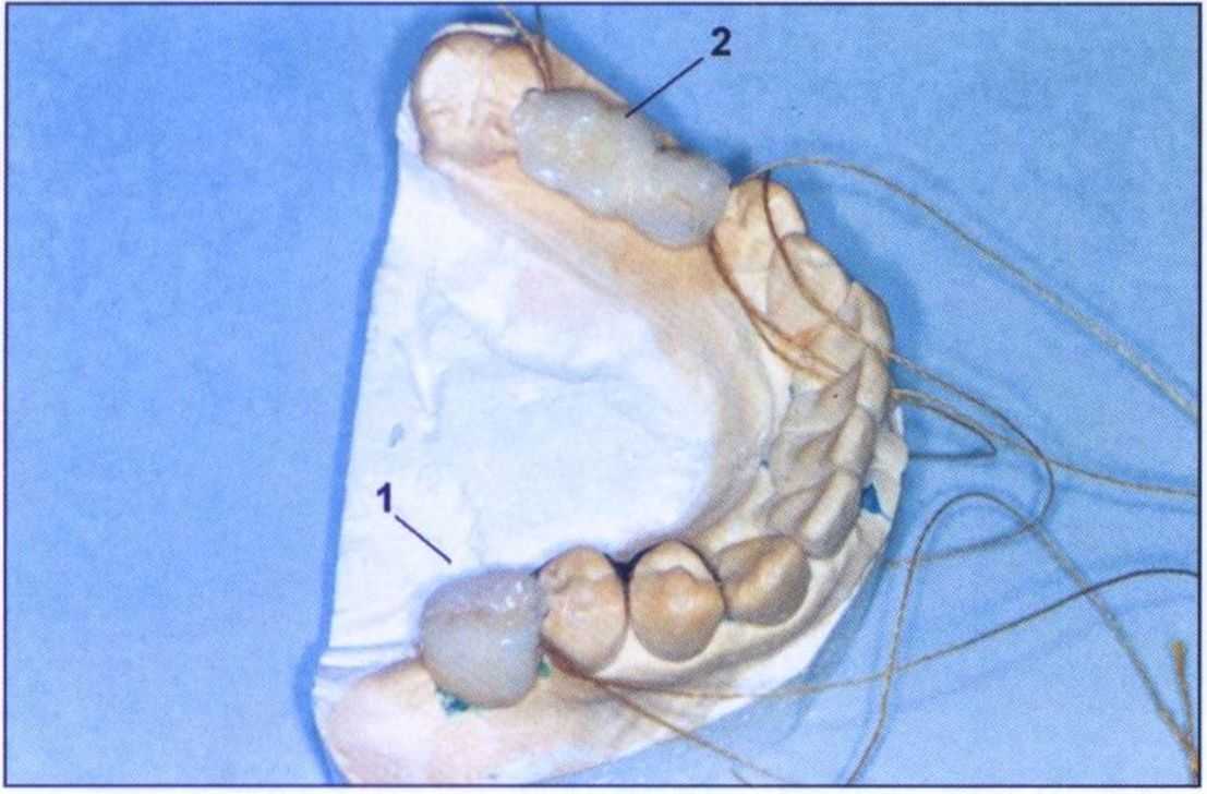 Рис. 6.48. Байтовый консольный протез (1) и вантовый протез с двухрядной фиксацией (2) |