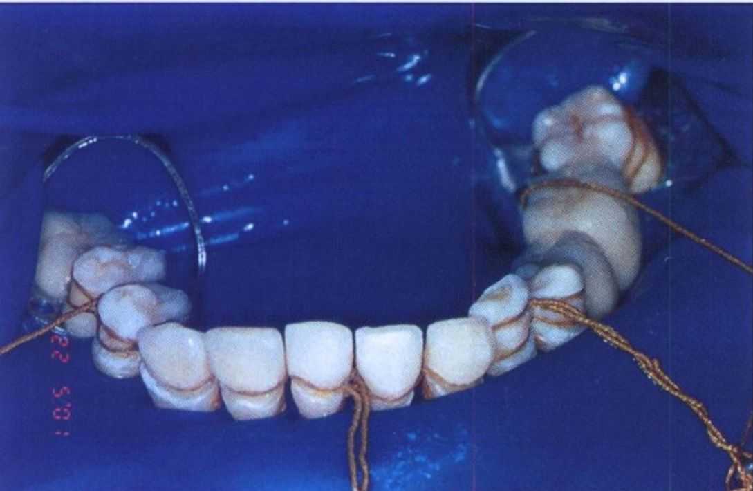 При подвижности зубов III-IV степени по вестибулярной поверхности опорных зубов делается один пропил в пришеечной области, а другой по краю, приближенному к окклюзионной поверхности, или к режущему краю зубов, в которых размещаются два ряда фиксирующих нитей.