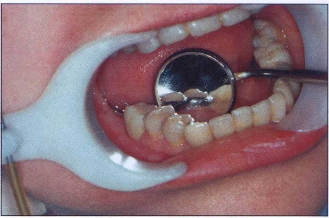 По оральной поверхности делается один более широкий пропил для размещения в них ретейнеров понтика (рис. 6.42). На опорном зубе фиксирующая нить с одной стороны соединена с конечной частью ретейнера, а с другой - с телом понтика. Нить натягивается, вестибулярная бороздка закрывается композиционным материалом.