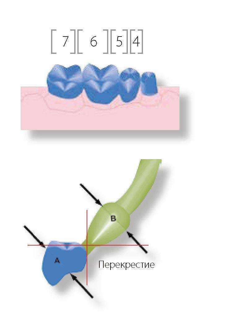 | Цельнолитые мостовидные протезы и каркасы большого объема при вакуумном литье с последующим воздействием давления Цельнолитой мостовидный протез от 4 до 7 4 = Цельнолитая коронка 5 = Цельнолитая промежуточная часть мостовидного протеза 6 = Цельнолитая промежуточная часть мостовидного протеза 7 = Цельнолитая коронка Если при вакуумном литье диаметр A превышает 5 мм, прибыль B должна иметь аналогичный диаметр. При этом подводящий литниковый канал выполняют диаметром не более 5 мм. К диаметру A приравнивают только диаметр прибыли B. Таким образом, даже при вакуумном литье с последующим воздействием давления необходимо предусматривать прибыль.