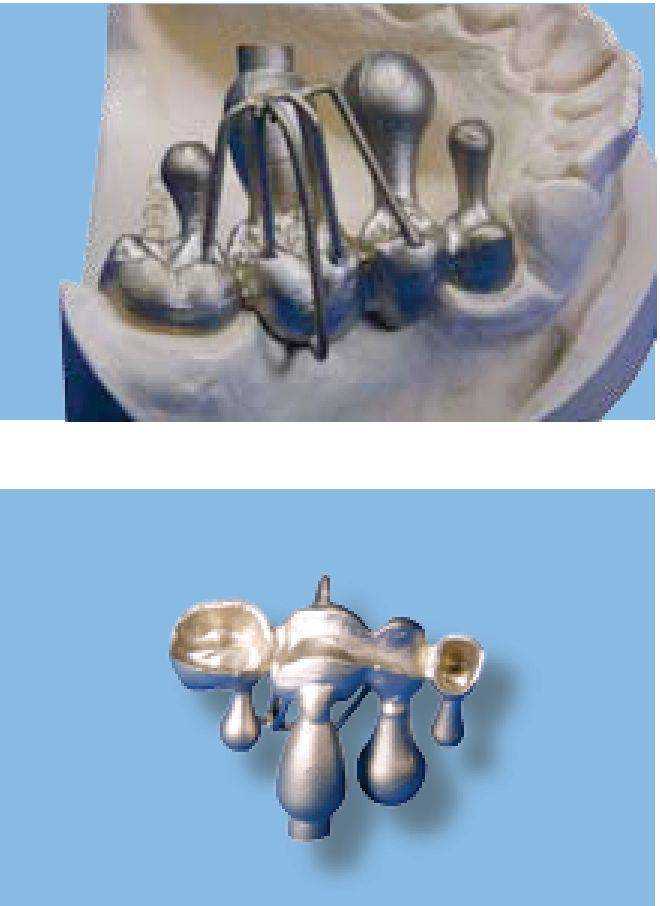 Диаметр прибылей в области 5 и 6 должен достигать диаметра промежуточной части мостовидного протеза. Качество и однородность каркаса мостовидного протеза определяют правильным выполнением условий направленного затвердевания сплава. Получение гладкой и однородной поверхности при литье каркасов с различным объемом элементов достигается установкой холодильников в виде ребер для направленной кристаллизации из восковой проволоки диаметром 1 мм, имеющих указанную на рисунке форму. Их крепят к восковой модели по диагонали от места крепления питателя и расположения литникового канала в точке a. Восковую проволоку устанавливают вертикально вверх примерно на 2-3 мм кпереди от промежуточного элемента и изгибают книзу на высоте =15-20 мм от места крепления, фиксируя к дистальному щечному бугру жевательной поверхности. После этого щечные и язычные (или небные) бугры жевательной поверхности соединяют между собою восковой проволокой, одинаковой по высоте в точке b с первой восковой проволочной петлей. Бугор e жевательной поверхности восковой модели промежуточного элемента 5 также должен быть соединен приклеенной восковой проволокой с точкой крепления b. Абсолютно необходимо связать медиальный щечный бугор f жевательной поверхности промежуточного элемента 6 с верхней точкой b.