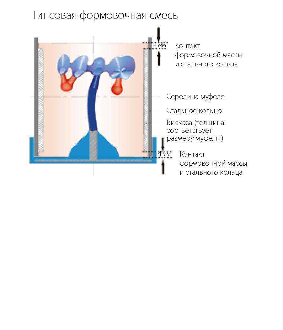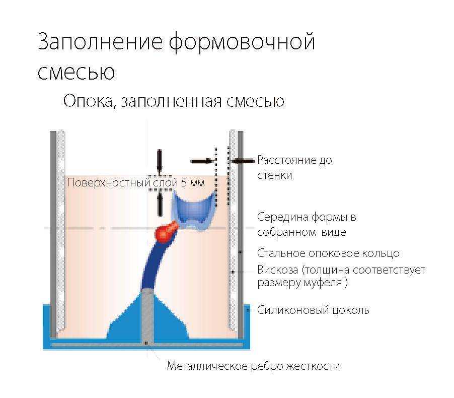 Коронки и мостовидные протезы должны быть расположены на расстоянии не менее 5 мм до стенки опоки для равномерного охлаждения металла после литья. Боковое расстояние при свободной установке кольца должно составлять от 6 до 7 мм. Форму, предварительно нагретую до температуры, рекомендованной производителем, заливают немедленно, так как опоковое кольцо быстро охлаждается и может создать проблемы. При заполнении кольца формовочной массой вначале с помощью тонкого инструмента заполняют коронки, чтобы не слишком долго подвергать формовочную массу вибрации. После этого опоковое кольцо заполняют смесью доверху. Восковой каркас перекрывают формовочной массой всего на 5 мм. Благодаря этому каркас протеза идеально точно и неподвижно зафиксирован после затвердевания собранной формы.