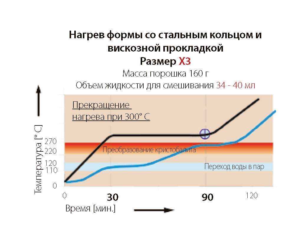 | Составление температурных кривых предварительного нагрева Предварительный нагрев формовочной массы без опокового кольца из формы X3 Черная линия на графике соответствует изменению температуры формы при температуре 270° C в центре печи. Синяя линия указывает на изменение температуры в центре формы (отличающееся от изменения температуры печи). Температура предварительного нагрева достигается примерно через 30 минут при скорости ее подъема 8° C в минуту до температуры выдержки 270° C, в то время как в формовочной массе при 110° C только начинается процесс испарения. Форму достаточно долго выдерживают при этой температуре, и по достижении 120° C в ее центре испарение завершено. Только тогда температура в форме снова поднимается в течении 30 минут нагрева плюс 30 минут выдержки до максимального значения 265° C. После прохождения этой точки температура в муфельной печи может далее подниматься. Подогрев стального опокового кольца с синтетической прокладкой - форма X3 При применении формы со стальным опоковым кольцом и прокладкой из синтетического полотна, для преобразования кристобалита необходимо остановить повышение температуры в печи на отметке 300° C. Стальное опоковое кольцо с вискозной прокладкой замедляет теплоотдачу настолько сильно, что при температуре от 270° C фактическая температура формы ниже температуры печи всего на 40° C, то есть 230° C. При температуре выдержки формы в печи 300° C, формовочная смесь нагрета только на 35° C ниже. Предварительный нагрев можно провести и при имеющихся 265° C. Используемая в этом случае формовочная масса имеет более высокое содержание влаги. По этой причине время испарения увеличивается до 60 минут выдержки.