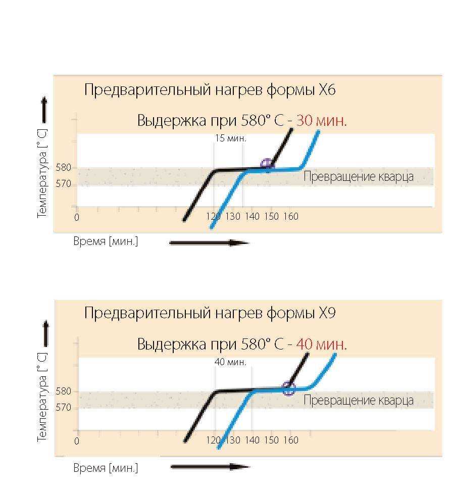 Превращение кварца Превращение кварца в процессе нагрева собранной формы начинается при температуре формовочной смеси от 570° C и связано с продолжительностью процесса. Как указывает приведенная рядом диаграмма, изменения начинаются только при температуре 570°C. Окончание превращения зависит от его длительности. Для полного перехода кварц должен быть выдержан 30 минут при температуре 570°C ... 580°C. Важно не то, какую температуру создает муфельная печь, а когда именно температура формовочной смеси в центре формы действительно достигла этого значения. Форма X3 Опоку с формовочной массой полностью высушивают при температуре 450°C. На этом участке нагрева от 300°C до 600°C воск или моделировочная пластмасса полностью выгорает в муфельной печи, то есть также имеет место термическое воздействие. Так как формовочная масса в опоке полностью высохла, теперь имеет значение только величина собранной формы, а не количество влаги (т.к. она уже испарилась). Температуру нагрева поднимают со скоростью менее 8° C в минуту до температуры 580°C. Форма величиной X3 нуждается в выдержке только 10 минут, пока масса не достигнет заданной температуры, после чего начинается превращение кварца. Собранная форма выдерживается в муфельной печи (если необходим дальнейший нагрев), так что в этом случае 30 минут для фазы выдержки вполне достаточно.