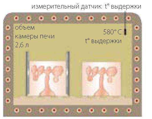 Если в центре формы температура достигла 900° C, процесс предварительного нагрева со всеми физико-химическими превращениями можно считать оконченным. Теперь необходимо регулировать температурный режим для качественного выполнения литья. ВНИМАНИЕ! Избегайте следующих ошибок: Если собранную форму устанавливают на определенную ступень нагрева, то следующая форма ни при каких обстоятельствах не может быть установлена в эту же муфельную печь позже. Это понижает температуру в камере муфельной печи и оказывает негативное влияние на протекание физико-химических процессов, а также на достижение температуры предварительного нагрева в центре формы. Очевидное последствие - недостаточная точность при припасовке и плохое качество поверхностей. Только после того, как прогретые формы переносят в следующую печь, можно вносить в камеру печи новые холодные формы..