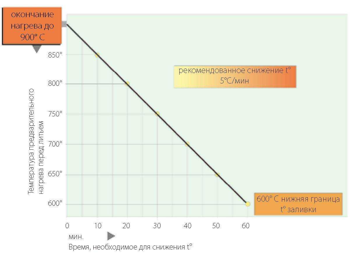 Температура литья выше или ниже 900° C Если производителем сплава рекомендована температура предварительного нагрева для литья выше 900° C, то формовочную массу на 3 ступени помещают в камеру с более высокой температурой и производят заливку по окончании выдержки при температуре 900° C, как указано в диаграмме. Если температура литья для формовочной смеси должна быть ниже 900° C, необходимо по прошествии выдержки при 900° C сократить время снижения температуры формы при снижении температуры камеры печи по приведенной рядом диаграмме. Затем можно заливать расплав.