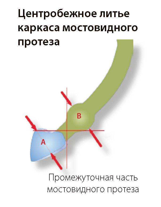 Если отдельные детали отливают центробежным способом при непосредственном питании, то для этого литниковые каналы изготавливают с прибылью. Из-за вращательного движения рычага центрифуги после заполнения расплавом возникает эффект вентиляции, который очень быстро охлаждает собранную форму снаружи по направлению к центру. По этой причине усадка расплава при охлаждении может привести к образованию дефекта отливки. Это приводит к нарушению структуры отливки в переходной области между зубным протезом и питателем. Диаметр питателя (В) уменьшается при вакуумном литье и должен достигать толщины стенки коронки (A) в месте контакта. Литниковый канал между прибылью (С) и заливочной воронкой имеет несколько больший диаметр, чем питатель между прибылью и коронкой (см. иллюстрацию). При центробежном литье с непосредственной заливкой можно разместить несколько отдельных отливаемых деталей в одной форме. При этом должны быть выполнены те же самые условия, как при вакуумном литье с допустимыми отклонениями, чтобы на литниковых каналах были использованы прибыли. При этом должны быть выполнены те же самые условия, как при вакуумном литье с допустимыми отклонениями, чтобы на литниковых каналах были использованы прибыли. Непосредственная заливка каркаса мостовидного протеза Вакуумное литье исключает возможность непосредственного заполнения каркаса мостовидного протеза. В этом случае литниковые каналы с прибылями в качестве резервуара расплава не могут быть использованы, так как вытесненный при затекании расплава воздух приведет к образованию воздушных пор.