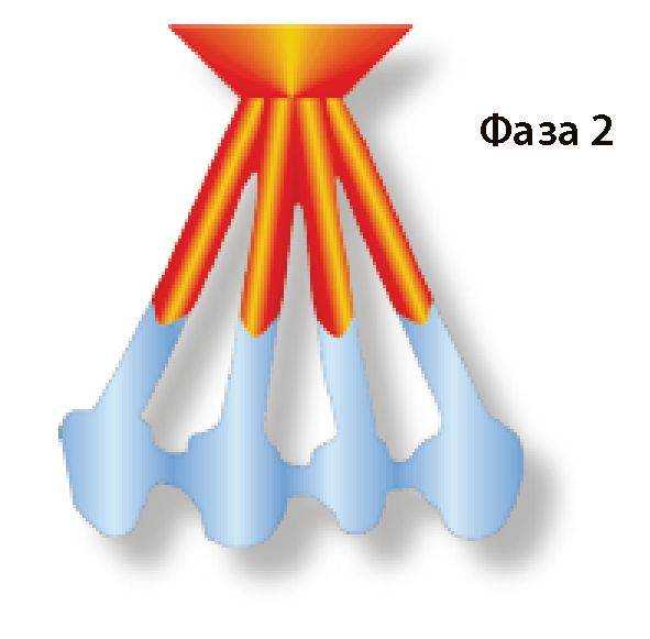 Фаза 2: Полость формы закрывается затекающим расплавом. Из-за этого сразу возникает непрерывно повышающееся противодействующее давление воздуха, так что расплав затекает компактно и направлено.