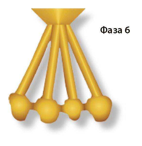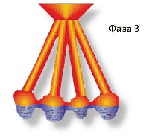 Непосредственным питанием называют такое строение литниковой системы, при котором каждая отливаемая деталь каркаса прикрепляется литниковым каналом непосредственно к заливочной воронке. Если речь идет только о тонких колпачках или промежуточных элементах, литниковый канал можно использовать без коллектора. Для демонстрации характера заполнения формы расплавом при этом способе литья на расположенной рядом иллюстрации представлена фаза 1: литейная полость собранной формы с непосредственными литниковыми каналами.