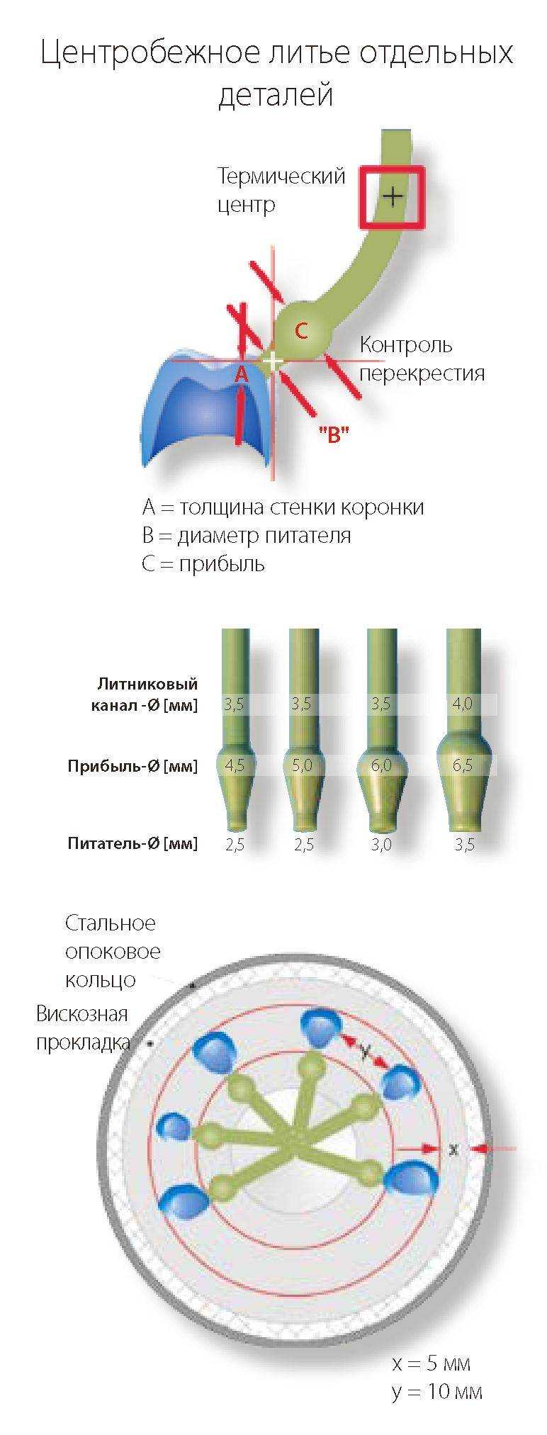 Фаза 5: Теперь воздух удаляется в литниковые каналы и заливочную воронку из литейной полости. Очень важно учитывать, что при вакуумном литье ни в коем случае не должно быть никакого переполнения заливочной воронки, чтобы воздух мог выйти прежде, чем давление металла этому воспрепятствовало бы. При центробежном литье должно быть соответственное наполнение заливочной воронки, чтобы достичь достаточного давления для уплотнения расплава при затвердевании под воздействием центробежной силы. Фаза 6: Качество заполнения похоже на коллекторное. Система литниковых каналов должна быть приспособлена для затвердевания расплава при непосредственной заливке объекта. „ Поведение сплава при охлаждении в литейной полости собранной формы ", см. главу 5 bredentтехника литья по Sabath. Непосредственное заполнение при литье отдельных объектов Размеры литниковых каналов для литья полных коронок, частичных коронок, накладок и вкладок должны отличаться по размерам при непосредственном заполнении в зависимости от применяемого способа литья (вакуумное или центробежное). Этот способ заливки лучше всего применим при литье отдельных объектов. Если непосредственная заливка выбирается при вакуумном литье, то литниковые каналы идут без изменения диаметра непосредственно к отливке. Исходная толщина отливаемой детали определяет диаметр литникового канала. При литье всех золотых, золотосодержащих сплавов и выгораемых лигатур с высоким содержанием золота, диаметр литникового канала (В) должен быть минимум в 1,5 раза больше толщины стенки коронки (A), желательно не менее 3 мм, чтобы не возникало проблем заполнения расплавом при вытеснении воздуха. При литье сплавов на основе палладия и цветных металлов, диаметр литникового канала должен не менее чем в 2 раза превышать толщину стенок коронки. Но и здесь необходимо помнить, что минимальный диаметр канала - 3,5 мм. Если в собранной форме размещается несколько объектов с отдельным питанием, то для достижения идентичного результата следует выдержать одинаковый тепловой режим для каждой отливаемой детали. Все объекты должны быть расположены на одинаковой высоте, находиться на расстоянии 5 мм от наружной стенки формы и 10 мм между собой. При вертикальной литниковой системе расстояние до опокового кольца или наружной поверхности формы составляет 5 мм для всех объектов. Литниковые каналы к отливке должны проходить через термический центр к литниковой воронке. Если все эти параметры выдержаны, результаты литья всех деталей идентичны.