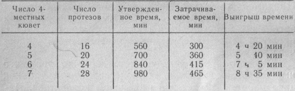 На данном этапе производительность труда зубного техника повышается вследствие того, что работы группируются, манипуляции объединяются и рабочее время «перекрывается», т. е. пока одна кювета вскрывается, другая в это время нагревается и т. п. При работе с 4-местными кюветами происходит значительный выигрыш времени (табл. 4).