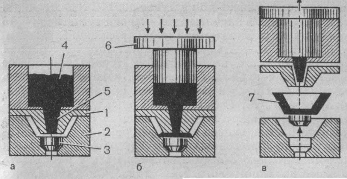 2. Промышленный способ литьевого прессования деталей, а — загрузочная камера заполненная пластмассой, б — под давлением поршня пластмасса через литниковый канал прессуется в полость, в — разъем формы; I — штамп, 2 — контрштамп, 3 — канал для выемки деталей, 4 — формуемая пластмасса, 5 — литьевой канал, 6 — поршень металлический, 7 — отпрессованная деталь.