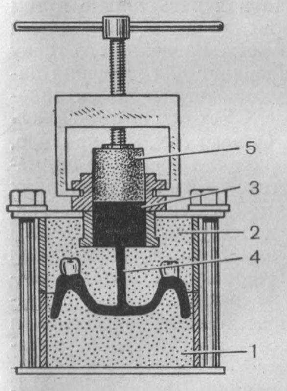 I — штамп, 2 — контрштамп, 3 — формуемая пластмасса, 4 — литьевой канал, 5 — резиновый поршень.