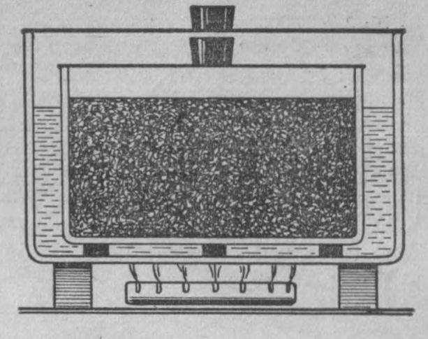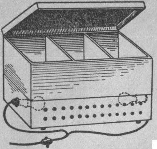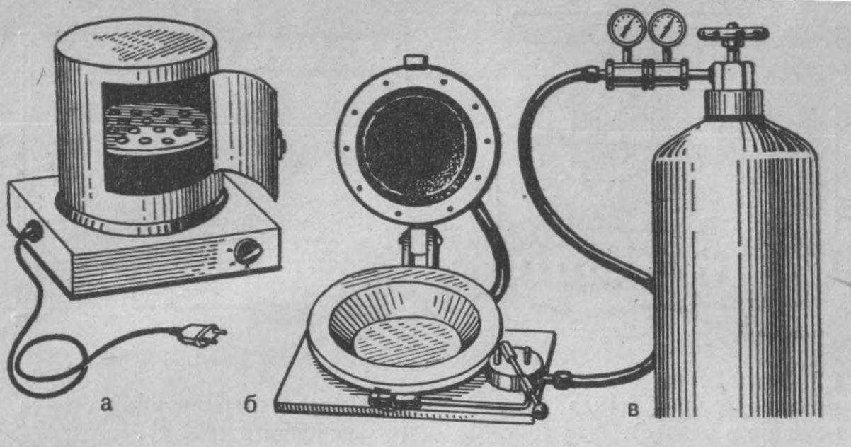 Термокамера. В простейшем виде представляет бытовую электрическую плитку с закрытой спиралью и терморегулятором, на который установлен металлический (из 1 мм жести) цилиндр высотой 100 мм и диаметром чуть больше нагревательного диска электроплитки. В крышке термокамеры имеется гнездо для термометра. Внутри на расстоянии 50 мм от плитки укреплена крупнопетлистая сетка, на которую помещается для разогревания термопластический материал. Сбоку имеется дверца.