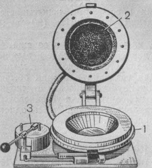 30. Пресс-форма. Общий вид. 1—основание, 2—резиновая диафрагма, 3 — клапанная система.