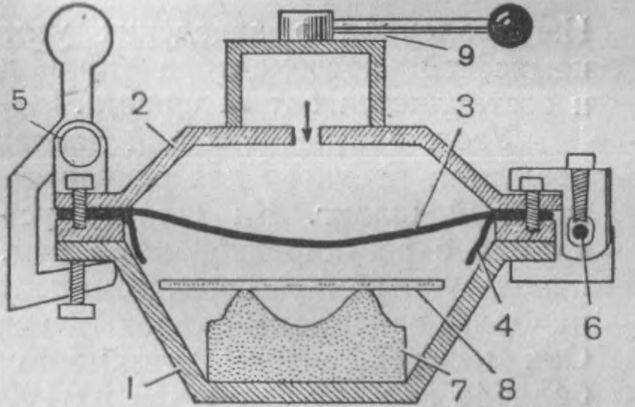— основание, 2 — крышка, 3 — резиновая диафрагма, 4 — замыкающее кольцо, 5 — ручка-защелка, 6 — шарнир, 7 — модель, 8 — пластинка термопластического материала, 9 — клапанная система.