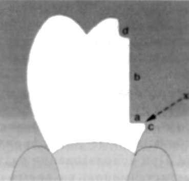 смесь не должна содержать загрязнений. Плохие результаты были получены при использовании огнеупорной массы, гранулят которой был в виде осколков различной величины. При работе с использованием фрезерования первичного элемента, гарантируется беспроблемная вставка съемной части протеза. Ступенчатая фрезеровка следует в соответствии с одинаково постоянным планом (рис I) Ширина ступени обеспечивает разгружающие распределительные плечи одинакового размера. Чем равномернее смоделирована общая вторичная конструкция, тем благоприятнее характеристика усадки после отливки. Поверхность отфрезерована на 2 градуса для того, чтобы получить возможность блокировки подрезки ниже точки С. Точка, получаемая на пересечении поверхностей А и С, обозначается как точка пересечения X. При моделировании можно накладывать воск ниже точки X (рис II). Усадка Со-СгМо-лигатур составляет в среднем