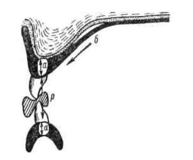 Рис. 3. Зоны напряжения в протезах при разжевывании. / — для верхней челюсти; 2 — для нижней челюсти; а — на сжатие, 6 — на растяжение, р — нагрузка.