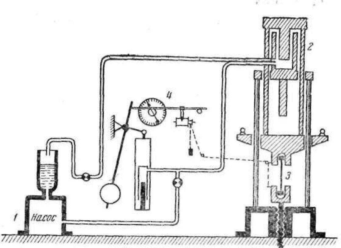 При пользовании прибором типа гидравлического пресса под действием насоса (1) приводится в действие пресс (2), поршень соединен с испытываемой деталью (3), когда он поднимается, создается напряжение — усилие, происходит растяжение и разрыв. Система приборов (4) соединена передачами с прессом и показывает усилие, затраченное на разрыв и растяжение.