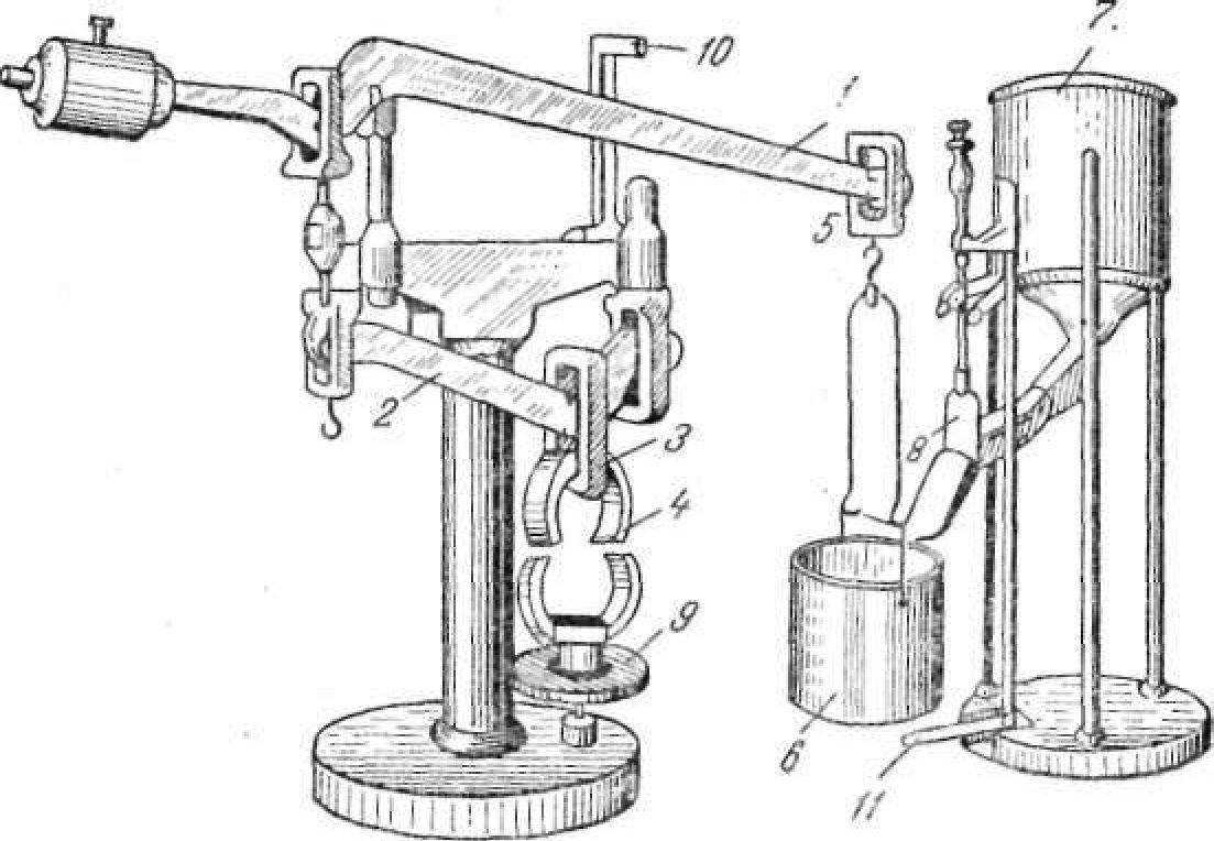 Рис. 5. Рычажный прибор для определения прочности на разрыв. Л 2 — верхний и нижний рычаги; 3, 5 — кольца; 4 — захват образца; 6 — ведерко для дроби; 7 — бункер; 8 — шиберная заслонка; 9 — регулировочный диск; 10 — ограничитель; // ~ педаль.
