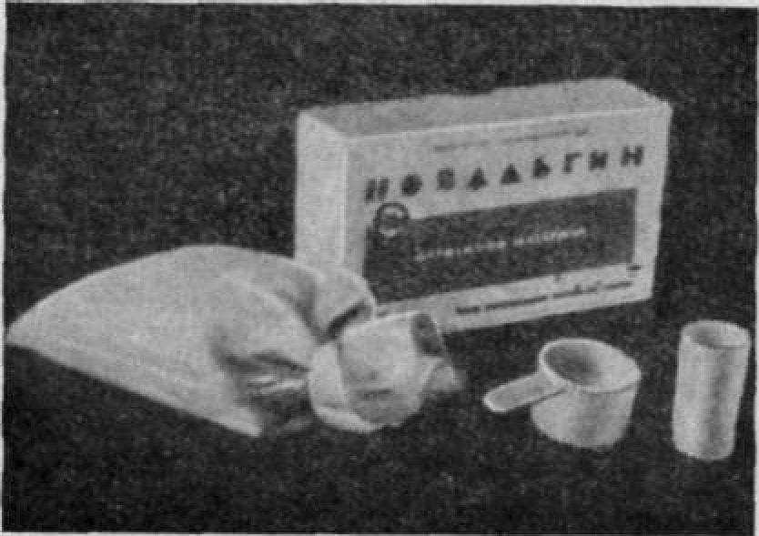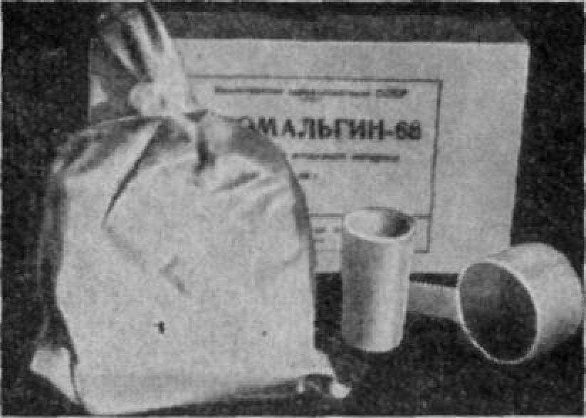 Новальгин (рис. 17). Новальгин — слепочный материал, составлен на основе альгината натрия, представляет собой тонкодисперсный порошок, который при" замешивании с водой образует пластичную слепочную массу, структуирующуюся в эластичный материал в течение нескольких минут при комнатной температуре. В отличие от других альгинатных слепочных материалов новальгин имеет повышенную прочность и твердость.